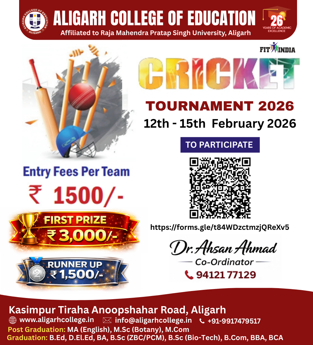 Aligarh College of Education, Aligarh is organizing a Cricket Tournament from 12th to 15th February 2026. Entry fee is Rs.1500/- per team. First Prize Rs.3000/- and Runner-Up Rs.1500/- Register Now to participate.