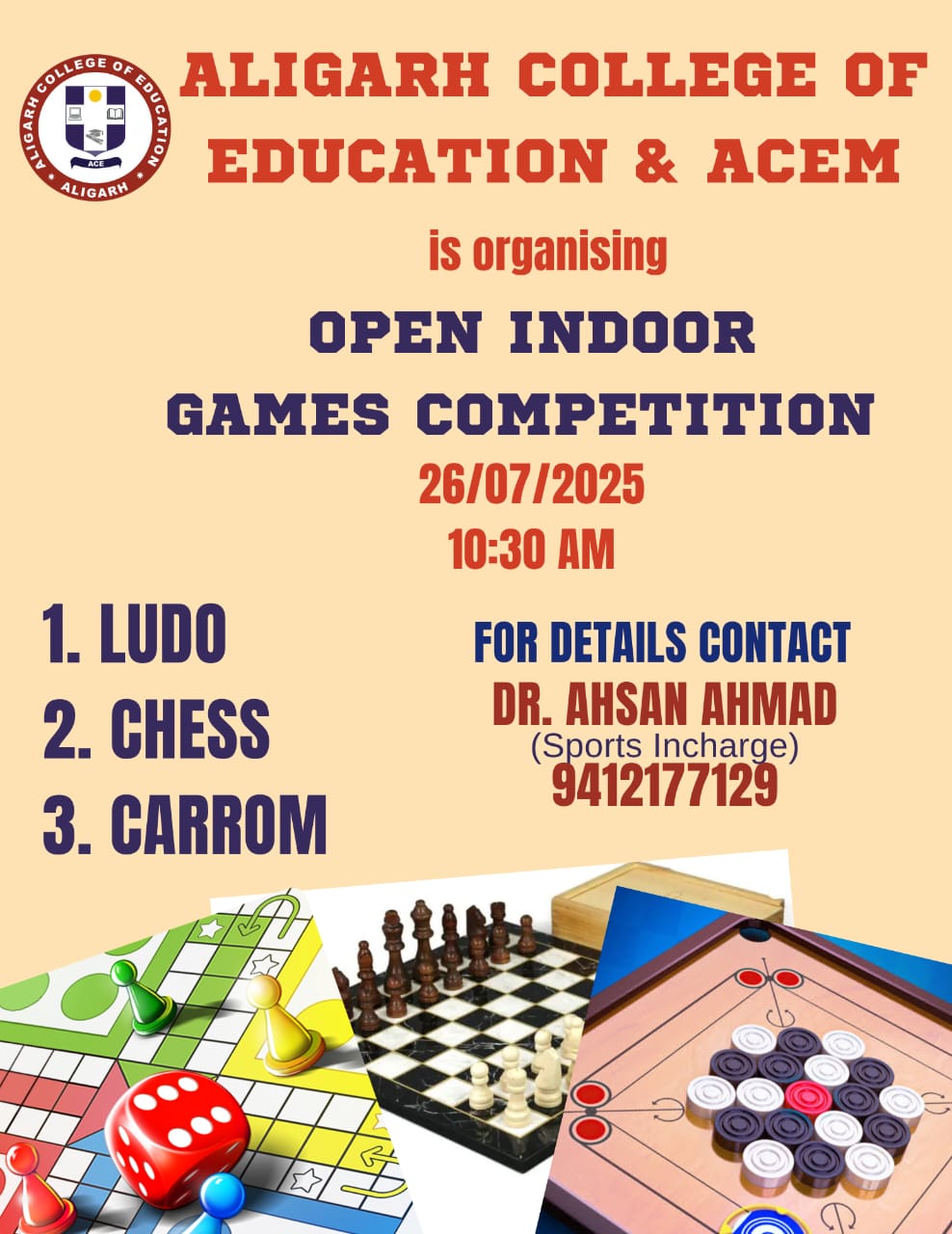 This is to inform all students and staff that an indoor games programme will be organised on 26/7/2025(Saturday) at 10:30 am in the college premises.