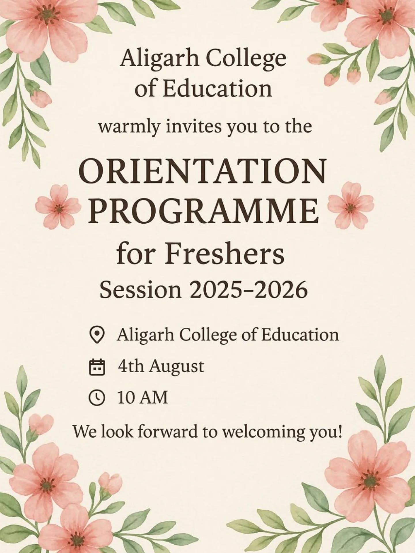 Aligarh College of Education warmly invites all freshers to the Orientation Programme for the session 2025-26 on 4th August 2025 at 10:00 AM. Join us to begin your academic journey with guidance, inspiration, and a warm welcome from our faculty and staff.